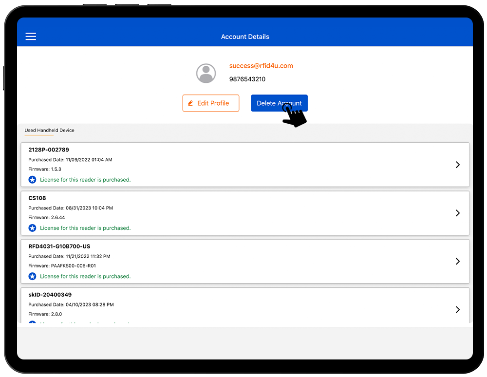 The first step in the account deletion process is reaching out to the RFID4U Success team through the dedicated email address:Success@rfid4u.com. Users who wish to delete their TagMatiks Wedge account can compose an email expressing their intent to do so.