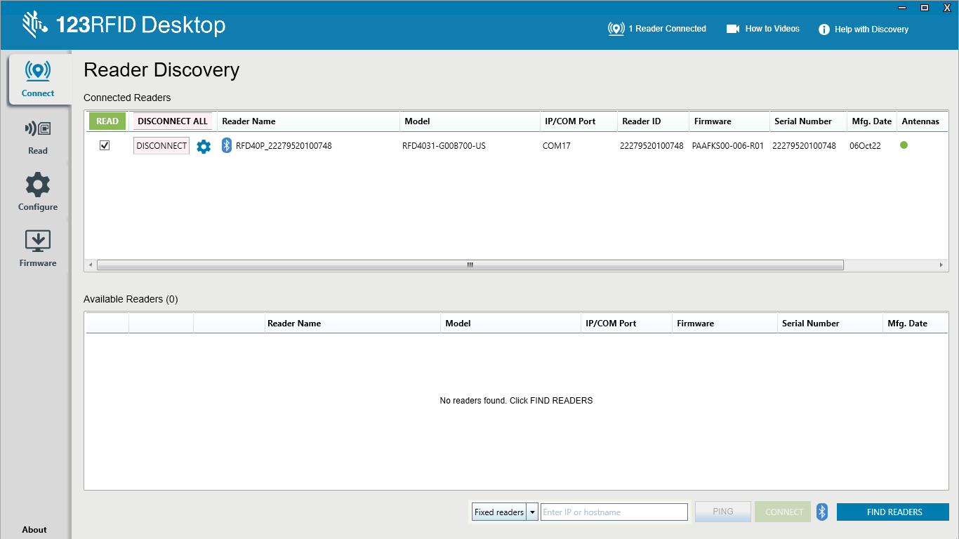9. Make sure your Zebra RFD40 is connected to the device you are using the software on. Once the software is loaded, it will automatically pick up the connected device, as shown below in Fig 0.5.