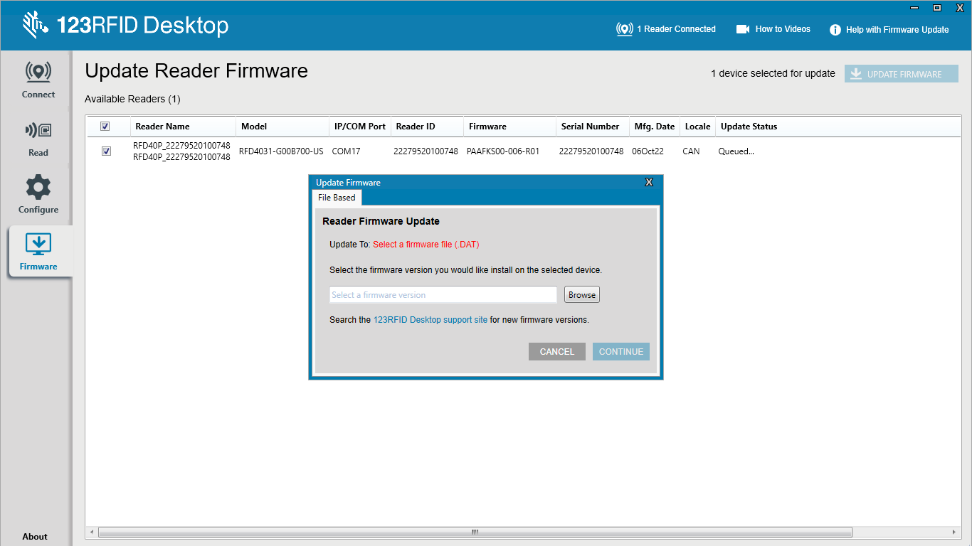 Download the firmware file onto the mobile device and connect the reader.