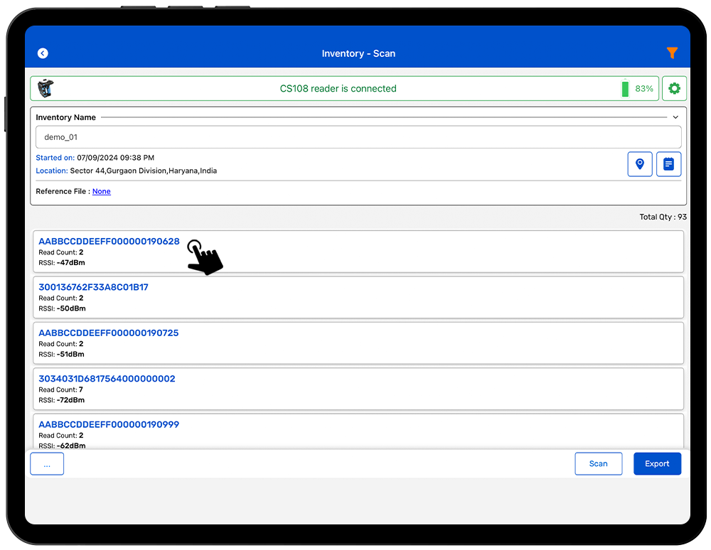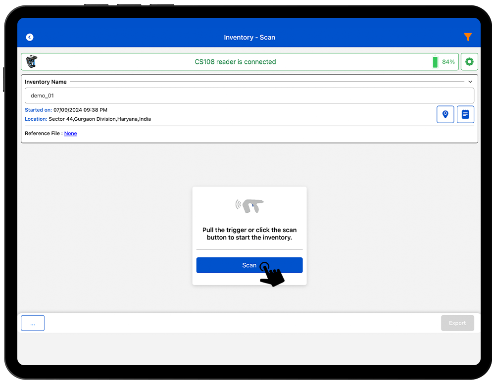 7. After , Click on + icon from inventory page.Click on the “Scan” button option for reading the RFID tags. As shown in Fig 1.5.