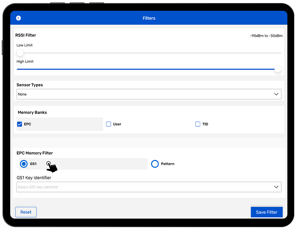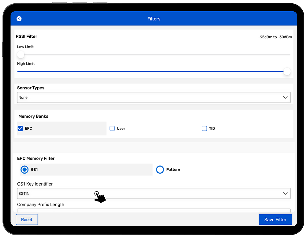 To enable an EPC Filter using a GS1 Key, select the GS1 option under EPC Memory Filters and then choose the GS1 Key Identifier from the dropdown list. Depending on the GS1 Key Identifier that you select, additional filters may be exposed. For example, if you choose the SGTIN GS1 Filter, the following options will be enable based on selection: