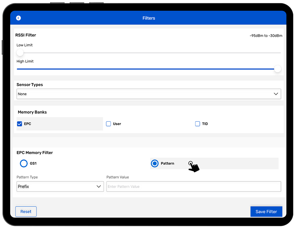 Example: If the Prefix filter is selected and the value AB is entered, only tags that have EPCs that start with AB will be captured.