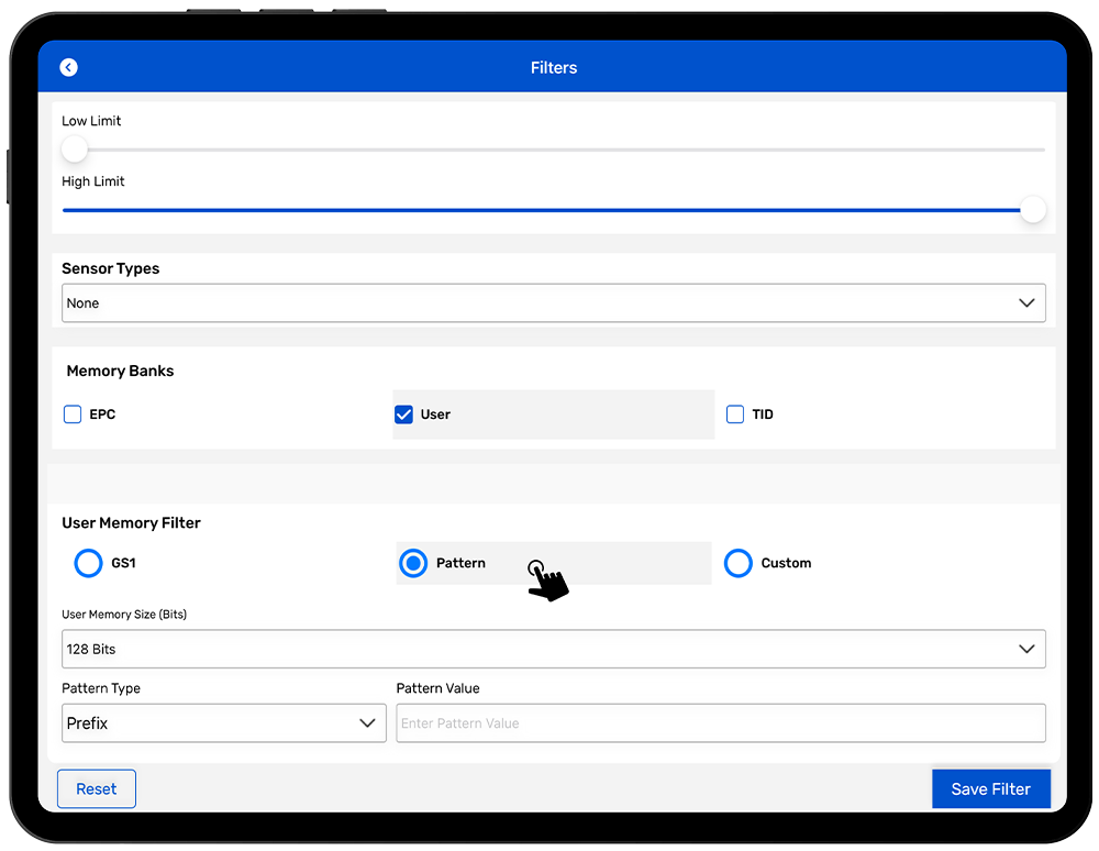 Example: If the Prefix filter is selected and the value AB is entered, only tags that have User Memory Banks that start with AB will be captured.