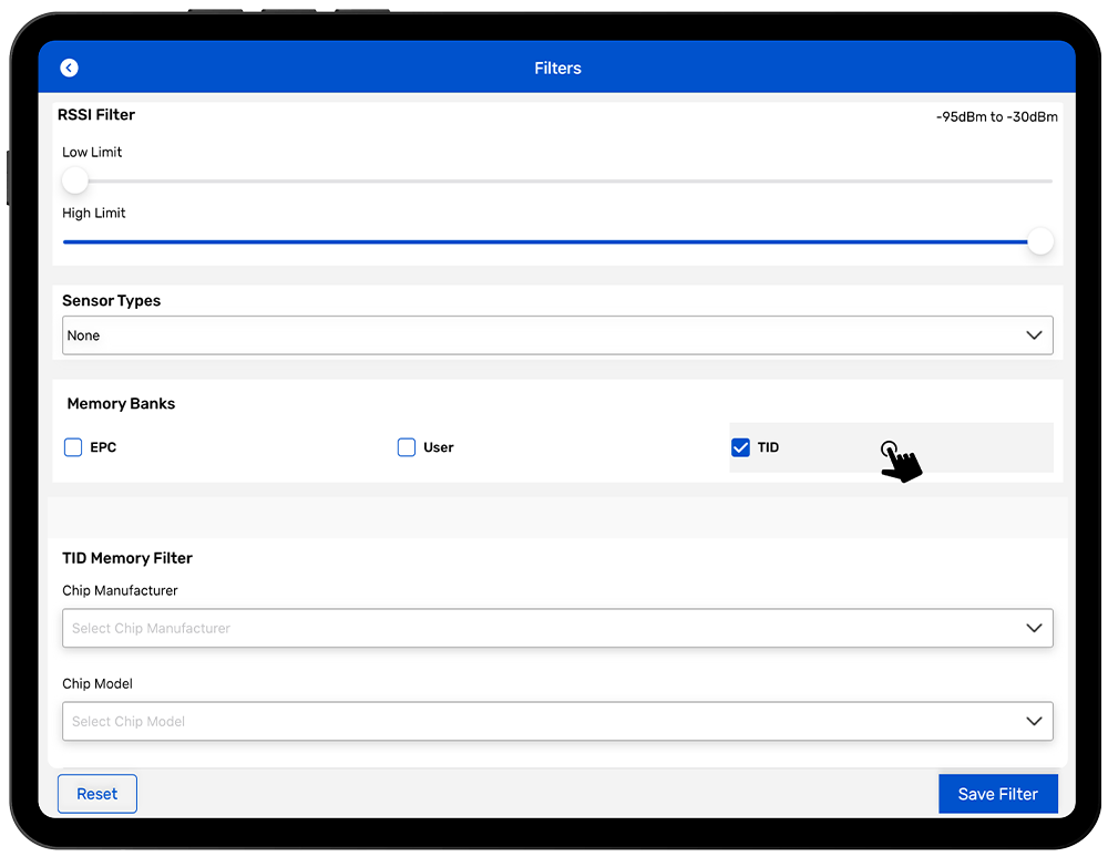 The TID memory bank is a memory bank that is factory encoded and locked. However, this memory bank holds important information about the RFID chip. If you enable this filter, you can read the manufacturer and chip model of the RFID tag.