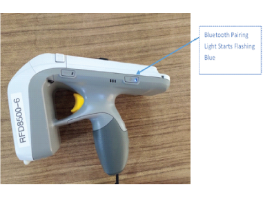When the RFD8500 device is powered on, the “Bluetooth Pairing” LED light will automatically start flashing Blue – this indicates that the RFD8500 device is now in discoverable mode and ready to pair with a nearby IOS device.