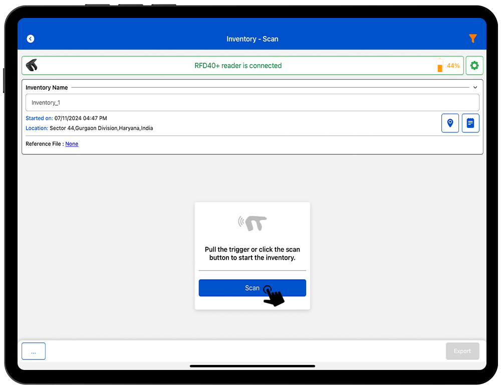 1. To read the RFID tags from Zebra RFD 40 reader; Click on the inventory button option from the home page of Application.