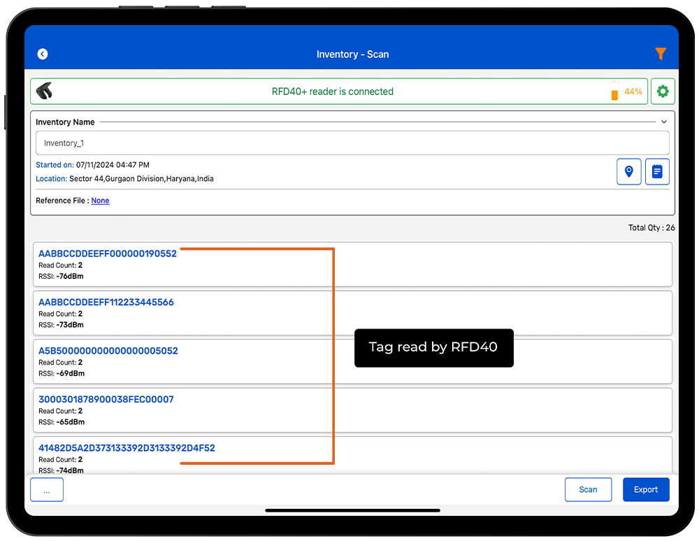 4. The RFD40 reader is in polling state and reading the tags. Same can be seen in the application window. Refer to the image below:1.2.