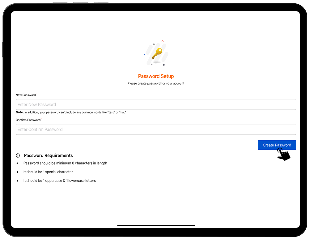 • An automated email will be sent to your registered email. Enter the access code onto the page. After successfully entering the access code, you’ll be able to create a new password. Please note the password requirements below: