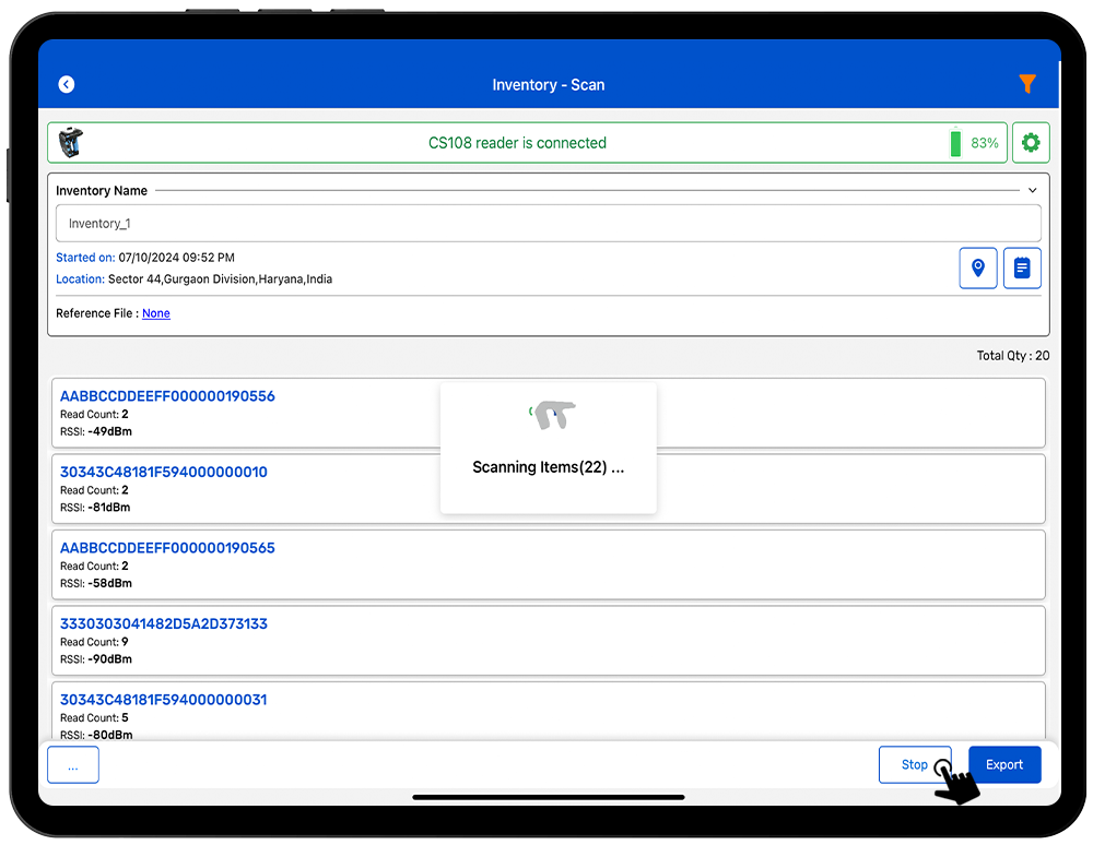 7. Once you Press “Stop” button (on the right bottom of the application); reader will stop reading the tags.
